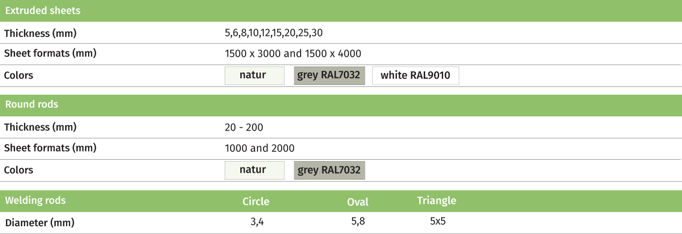PP homopolymers are types of polypropylene that exhibit higher hardness, stiffness at room temperature compared to copolymers and tensile strength. However, at temperatures around freezing point they become very brittle due to their molecular structure. Materials PP-H are very strong and resistant to stress cracks, chemicals, corrosion and heat. Materials in natural and grey colours comply with the food contact regulations according to 10/2011/EC. PP-H is not suitable for outdoor usage – no UV protection.